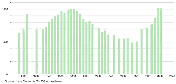L'évolution du nombre d'habitants est connue à travers les recensements de la population effectués dans la commune depuis 1793. Pour les communes de moins de 10 000 habitants, une enquête de recensement portant sur toute la population est réalisée tous les cinq ans, les populations légales des années intermédiaires étant quant à elles estimées par interpolation ou extrapolation[25]. Pour la commune, le premier recensement exhaustif entrant dans le cadre du nouveau dispositif a été réalisé en 2007[26].