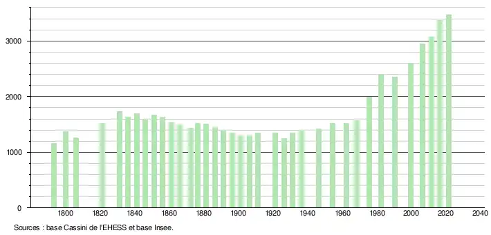 L'évolution du nombre d'habitants est connue à travers les recensements de la population effectués dans la commune depuis 1793. Pour les communes de moins de 10 000 habitants, une enquête de recensement portant sur toute la population est réalisée tous les cinq ans, les populations légales des années intermédiaires étant quant à elles estimées par interpolation ou extrapolation[34]. Pour la commune, le premier recensement exhaustif entrant dans le cadre du nouveau dispositif a été réalisé en 2006[35].