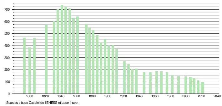 L'évolution du nombre d'habitants est connue à travers les recensements de la population effectués dans la commune depuis 1793. Pour les communes de moins de 10 000 habitants, une enquête de recensement portant sur toute la population est réalisée tous les cinq ans, les populations légales des années intermédiaires étant quant à elles estimées par interpolation ou extrapolation[18]. Pour la commune, le premier recensement exhaustif entrant dans le cadre du nouveau dispositif a été réalisé en 2005[19].