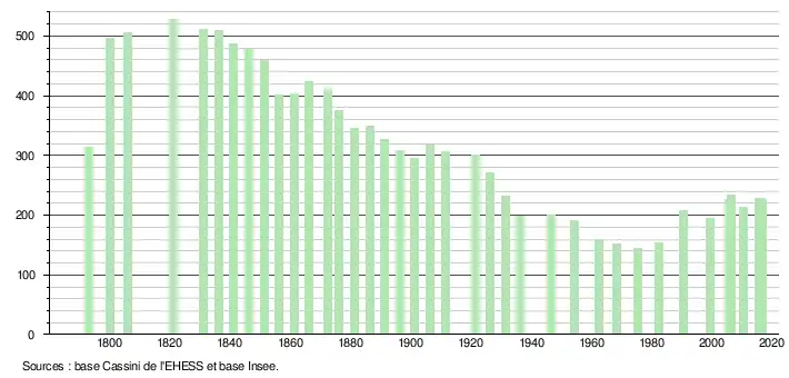 L'évolution du nombre d'habitants est connue à travers les recensements de la population effectués dans la commune depuis 1793. Pour les communes de moins de 10 000 habitants, une enquête de recensement portant sur toute la population est réalisée tous les cinq ans, les populations légales des années intermédiaires étant quant à elles estimées par interpolation ou extrapolation[3]. Pour la commune, le premier recensement exhaustif entrant dans le cadre du nouveau dispositif a été réalisé en 2005[4].