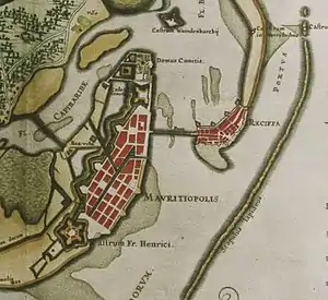 Plutôt que la capitale du Brésil Bahia comme en 1624, les Hollandais s'attaquent en 1630 à trois îles situées dans l'embouchure conjointe de plusieurs rivières[48]. Les navires de la WIC bombardent massivement et incendient la petite ville coloniale d'Olinda que les Portugais désertent le . Puis ils s'installent le dans la petite île qui leur servait de port de pêche 5 km plus loin, Recife[49], dont le nom illustre un récif naturel protégeant l'embouchure des trois rivières: ce sera capitainerie de la région de Pernambuco. Les Hollandais ne s'arrêtent pas à Récife, et continuent leurs dévastation dans la région de Natal (Rio Grande do Norte). Les cartes de propagande hollandaise de 1630 montrent que les alentours d'Olinda étaient essentiellement boisées[49], avec des illustrations montrant travail inhumain des esclaves dans les moulins à sucre[49], présentés comme au service des "Espagnols"[49], et des entrepôts que les Portugais ont eux-mêmes brûlés[49].