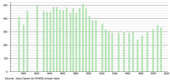 L'évolution du nombre d'habitants est connue à travers les recensements de la population effectués dans la commune depuis 1793. À partir du , les populations légales des communes sont publiées annuellement dans le cadre d'un recensement qui repose désormais sur une collecte d'information annuelle, concernant successivement tous les territoires communaux au cours d'une période de cinq ans. Pour les communes de moins de 10 000 habitants, une enquête de recensement portant sur toute la population est réalisée tous les cinq ans, les populations légales des années intermédiaires étant quant à elles estimées par interpolation ou extrapolation[15]. Pour la commune, le premier recensement exhaustif entrant dans le cadre du nouveau dispositif a été réalisé en 2007[16],[Note 2].