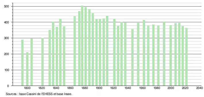 L'évolution du nombre d'habitants est connue à travers les recensements de la population effectués dans la commune depuis 1793. Pour les communes de moins de 10 000 habitants, une enquête de recensement portant sur toute la population est réalisée tous les cinq ans, les populations légales des années intermédiaires étant quant à elles estimées par interpolation ou extrapolation[18]. Pour la commune, le premier recensement exhaustif entrant dans le cadre du nouveau dispositif a été réalisé en 2006[19].