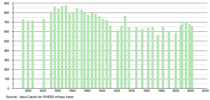 L'évolution du nombre d'habitants est connue à travers les recensements de la population effectués dans la commune depuis 1793. Pour les communes de moins de 10 000 habitants, une enquête de recensement portant sur toute la population est réalisée tous les cinq ans, les populations légales des années intermédiaires étant quant à elles estimées par interpolation ou extrapolation[20]. Pour la commune, le premier recensement exhaustif entrant dans le cadre du nouveau dispositif a été réalisé en 2008[21].