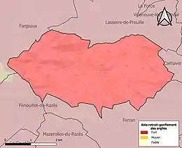 Le retrait-gonflement des sols argileux est susceptible d'engendrer des dommages importants aux bâtiments en cas d’alternance de périodes de sécheresse et de pluie. La totalité de la commune est en aléa moyen ou fort (75,2 % au niveau départemental et 48,5 % au niveau national). Sur les 91 bâtiments dénombrés sur la commune en 2019, 91 sont en aléa moyen ou fort, soit 100 %, à comparer aux 94 % au niveau départemental et 54 % au niveau national. Une cartographie de l'exposition du territoire national au retrait gonflement des sols argileux est disponible sur le site du BRGM[19],[Carte 3].