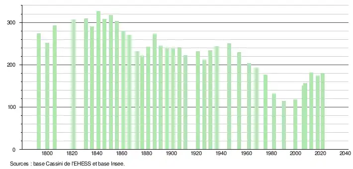 L'évolution du nombre d'habitants est connue à travers les recensements de la population effectués dans la commune depuis 1793. Pour les communes de moins de 10 000 habitants, une enquête de recensement portant sur toute la population est réalisée tous les cinq ans, les populations légales des années intermédiaires étant quant à elles estimées par interpolation ou extrapolation[22]. Pour la commune, le premier recensement exhaustif entrant dans le cadre du nouveau dispositif a été réalisé en 2007[23].