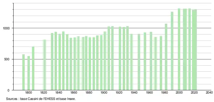 L'évolution du nombre d'habitants est connue à travers les recensements de la population effectués dans la commune depuis 1793. Pour les communes de moins de 10 000 habitants, une enquête de recensement portant sur toute la population est réalisée tous les cinq ans, les populations légales des années intermédiaires étant quant à elles estimées par interpolation ou extrapolation[43]. Pour la commune, le premier recensement exhaustif entrant dans le cadre du nouveau dispositif a été réalisé en 2008[44].