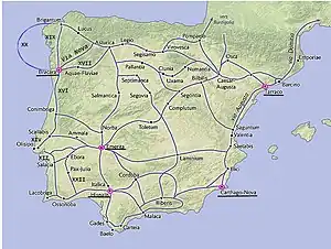 - Voie romaine XVII — partant de la limite orientale de la ville et passant par Acquae Flaviae (Chaves (Portugal)), d'où elle continue jusqu'à Astorga.