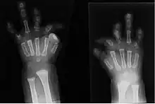 La brachydactylie est un terme de médecine signifiant : brièveté d'un ou de plusieurs doigts. C'est une caractéristique dont la transmission génétique est généralement autosomique dominante[1],[2].la brachydactylie est de 5 types de A à E et cinq sous types de A1 à A5.
