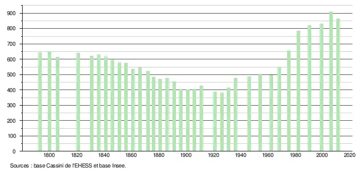L'évolution du nombre d'habitants est connue à travers les recensements de la population effectués dans la commune depuis 1793. À partir du , les populations légales des communes sont publiées annuellement dans le cadre d'un recensement qui repose désormais sur une collecte d'information annuelle, concernant successivement tous les territoires communaux au cours d'une période de cinq ans. Pour les communes de moins de 10 000 habitants, une enquête de recensement portant sur toute la population est réalisée tous les cinq ans, les populations légales des années intermédiaires étant quant à elles estimées par interpolation ou extrapolation[8]. Pour la commune, le premier recensement exhaustif entrant dans le cadre du nouveau dispositif a été réalisé en 2006[9],[Note 1].