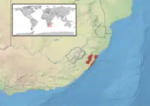 Cette espèce se rencontre au Cap-Oriental et au KwaZulu-Natal en Afrique du Sud et au Mozambique[1].