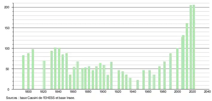 L'évolution du nombre d'habitants est connue à travers les recensements de la population effectués dans la commune depuis 1793. Pour les communes de moins de 10 000 habitants, une enquête de recensement portant sur toute la population est réalisée tous les cinq ans, les populations légales des années intermédiaires étant quant à elles estimées par interpolation ou extrapolation[19]. Pour la commune, le premier recensement exhaustif entrant dans le cadre du nouveau dispositif a été réalisé en 2007[20].