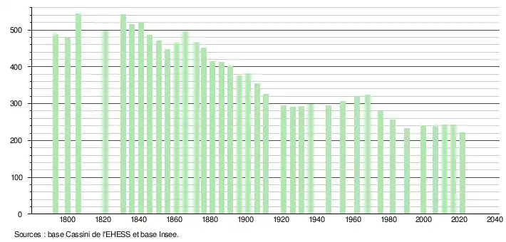 L'évolution du nombre d'habitants est connue à travers les recensements de la population effectués dans la commune depuis 1793. Pour les communes de moins de 10 000 habitants, une enquête de recensement portant sur toute la population est réalisée tous les cinq ans, les populations légales des années intermédiaires étant quant à elles estimées par interpolation ou extrapolation[24]. Pour la commune, le premier recensement exhaustif entrant dans le cadre du nouveau dispositif a été réalisé en 2006[25].
