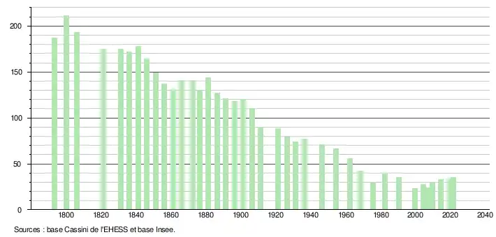 L'évolution du nombre d'habitants est connue à travers les recensements de la population effectués dans la commune depuis 1793. Pour les communes de moins de 10 000 habitants, une enquête de recensement portant sur toute la population est réalisée tous les cinq ans, les populations légales des années intermédiaires étant quant à elles estimées par interpolation ou extrapolation[14]. Pour la commune, le premier recensement exhaustif entrant dans le cadre du nouveau dispositif a été réalisé en 2004[15].