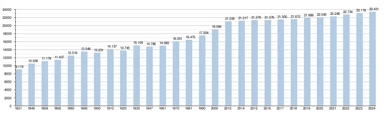Elle comptait, au , 23 534 habitants (11 526 hommes et 12 008 femmes)[5], soit une densité de 277,29 habitants/km2 pour une superficie de 84,87 km2[6].