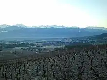 Vue de Brame-Farine à gauche du Grésivaudan depuis les vignobles de Montmélian au pied du massif des Bauges au nord. | |