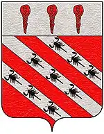 Les armes des Brandolin: six bandes de gueules et d'argent, les trois d'argent chargées de six scorpions de sable; 1, 3, 2 sous un chef d'argent chargé de trois ceintures.