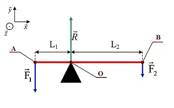 Le principe fondamental de la statique (PFS) appliqué au système {levier} au point O donne deux équations vectorielles :