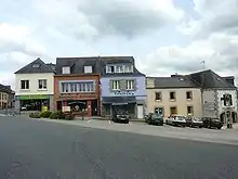 Le bourg apparaît perché depuis la route du Faou. | |||||