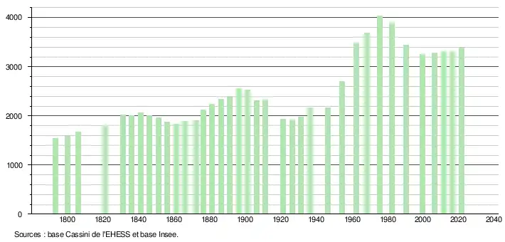 L'évolution du nombre d'habitants est connue à travers les recensements de la population effectués dans la commune depuis 1793. Pour les communes de moins de 10 000 habitants, une enquête de recensement portant sur toute la population est réalisée tous les cinq ans, les populations légales des années intermédiaires étant quant à elles estimées par interpolation ou extrapolation[27]. Pour la commune, le premier recensement exhaustif entrant dans le cadre du nouveau dispositif a été réalisé en 2006[28].