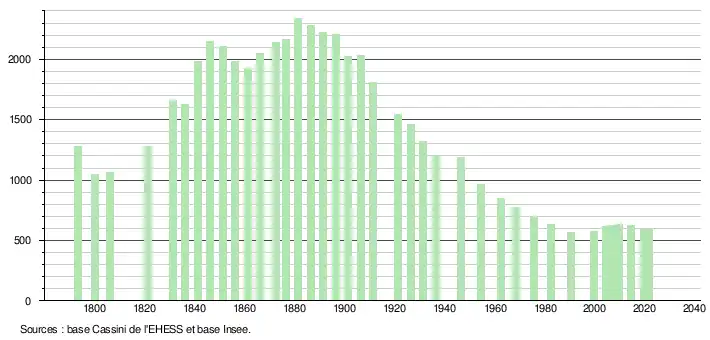 L'évolution du nombre d'habitants est connue à travers les recensements de la population effectués dans la commune depuis 1793. Pour les communes de moins de 10 000 habitants, une enquête de recensement portant sur toute la population est réalisée tous les cinq ans, les populations légales des années intermédiaires étant quant à elles estimées par interpolation ou extrapolation[14]. Pour la commune, le premier recensement exhaustif entrant dans le cadre du nouveau dispositif a été réalisé en 2004[15].