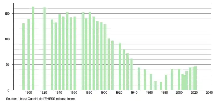 L'évolution du nombre d'habitants est connue à travers les recensements de la population effectués dans la commune depuis 1793. Pour les communes de moins de 10 000 habitants, une enquête de recensement portant sur toute la population est réalisée tous les cinq ans, les populations légales des années intermédiaires étant quant à elles estimées par interpolation ou extrapolation[16]. Pour la commune, le premier recensement exhaustif entrant dans le cadre du nouveau dispositif a été réalisé en 2004[17].