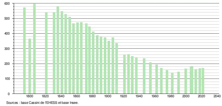 L'évolution du nombre d'habitants est connue à travers les recensements de la population effectués dans la commune depuis 1793. Pour les communes de moins de 10 000 habitants, une enquête de recensement portant sur toute la population est réalisée tous les cinq ans, les populations légales des années intermédiaires étant quant à elles estimées par interpolation ou extrapolation[15]. Pour la commune, le premier recensement exhaustif entrant dans le cadre du nouveau dispositif a été réalisé en 2007[16].
