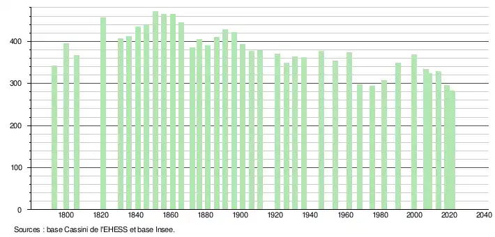 L'évolution du nombre d'habitants est connue à travers les recensements de la population effectués dans la commune depuis 1793. Pour les communes de moins de 10 000 habitants, une enquête de recensement portant sur toute la population est réalisée tous les cinq ans, les populations légales des années intermédiaires étant quant à elles estimées par interpolation ou extrapolation[27]. Pour la commune, le premier recensement exhaustif entrant dans le cadre du nouveau dispositif a été réalisé en 2008[28].