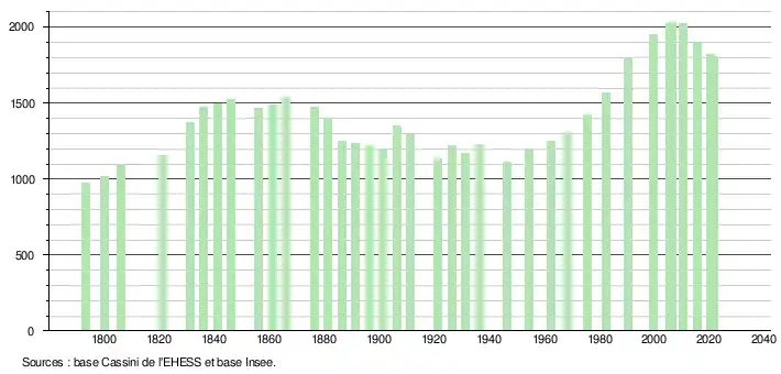 L'évolution du nombre d'habitants est connue à travers les recensements de la population effectués dans la commune depuis 1793. Pour les communes de moins de 10 000 habitants, une enquête de recensement portant sur toute la population est réalisée tous les cinq ans, les populations légales des années intermédiaires étant quant à elles estimées par interpolation ou extrapolation[31]. Pour la commune, le premier recensement exhaustif entrant dans le cadre du nouveau dispositif a été réalisé en 2005[32].