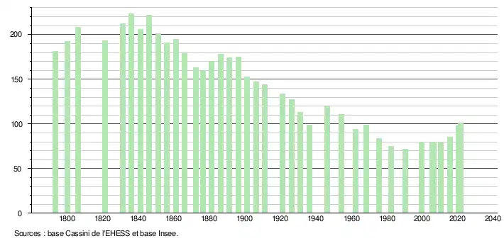 L'évolution du nombre d'habitants est connue à travers les recensements de la population effectués dans la commune depuis 1793. Pour les communes de moins de 10 000 habitants, une enquête de recensement portant sur toute la population est réalisée tous les cinq ans, les populations légales des années intermédiaires étant quant à elles estimées par interpolation ou extrapolation[17]. Pour la commune, le premier recensement exhaustif entrant dans le cadre du nouveau dispositif a été réalisé en 2005[18].