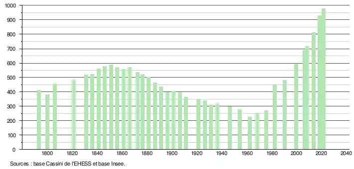 L'évolution du nombre d'habitants est connue à travers les recensements de la population effectués dans la commune depuis 1793. Pour les communes de moins de 10 000 habitants, une enquête de recensement portant sur toute la population est réalisée tous les cinq ans, les populations légales des années intermédiaires étant quant à elles estimées par interpolation ou extrapolation[16]. Pour la commune, le premier recensement exhaustif entrant dans le cadre du nouveau dispositif a été réalisé en 2008[17].