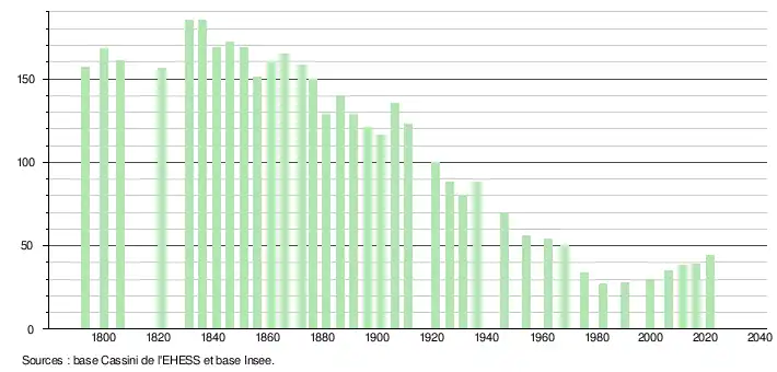 L'évolution du nombre d'habitants est connue à travers les recensements de la population effectués dans la commune depuis 1793. Pour les communes de moins de 10 000 habitants, une enquête de recensement portant sur toute la population est réalisée tous les cinq ans, les populations légales des années intermédiaires étant quant à elles estimées par interpolation ou extrapolation[15]. Pour la commune, le premier recensement exhaustif entrant dans le cadre du nouveau dispositif a été réalisé en 2006[16].