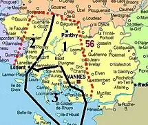 - le bas-vannetais (entre la rivière Ellé et une ligne reliant Hennebont, Bubry et Cléguérec),