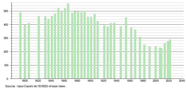 L'évolution du nombre d'habitants est connue à travers les recensements de la population effectués dans la commune depuis 1793. Pour les communes de moins de 10 000 habitants, une enquête de recensement portant sur toute la population est réalisée tous les cinq ans, les populations légales des années intermédiaires étant quant à elles estimées par interpolation ou extrapolation[23]. Pour la commune, le premier recensement exhaustif entrant dans le cadre du nouveau dispositif a été réalisé en 2008[24].