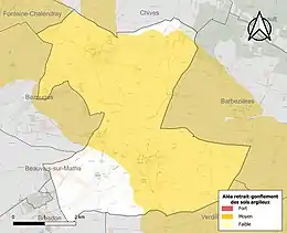 Le retrait-gonflement des sols argileux est susceptible d'engendrer des dommages importants aux bâtiments en cas d’alternance de périodes de sécheresse et de pluie. 80,1 % de la superficie communale est en aléa moyen ou fort (67,4 % au niveau départemental et 48,5 % au niveau national). Sur les 122 bâtiments dénombrés sur la commune en 2019, 115 sont en aléa moyen ou fort, soit 94 %, à comparer aux 81 % au niveau départemental et 54 % au niveau national. Une cartographie de l'exposition du territoire national au retrait gonflement des sols argileux est disponible sur le site du BRGM[19],[Carte 3].