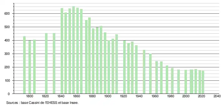 L'évolution du nombre d'habitants est connue à travers les recensements de la population effectués dans la commune depuis 1793. Pour les communes de moins de 10 000 habitants, une enquête de recensement portant sur toute la population est réalisée tous les cinq ans, les populations légales des années intermédiaires étant quant à elles estimées par interpolation ou extrapolation[32]. Pour la commune, le premier recensement exhaustif entrant dans le cadre du nouveau dispositif a été réalisé en 2007[33].