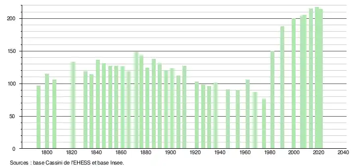 L'évolution du nombre d'habitants est connue à travers les recensements de la population effectués dans la commune depuis 1793. Pour les communes de moins de 10 000 habitants, une enquête de recensement portant sur toute la population est réalisée tous les cinq ans, les populations légales des années intermédiaires étant quant à elles estimées par interpolation ou extrapolation[32]. Pour la commune, le premier recensement exhaustif entrant dans le cadre du nouveau dispositif a été réalisé en 2008[33].