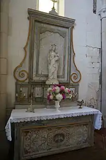 L’édifice a un chœur ordinaire du XIIIe siècle et abrite un panneau peint du XVIIIe siècle. Il représente une colombe (symbole du Saint-Esprit) et des rinceaux, et fut classé le 12 janvier 1977 au titre des Monuments historiques[37].
