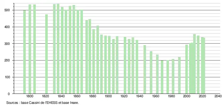 L'évolution du nombre d'habitants est connue à travers les recensements de la population effectués dans la commune depuis 1793. Pour les communes de moins de 10 000 habitants, une enquête de recensement portant sur toute la population est réalisée tous les cinq ans, les populations légales des années intermédiaires étant quant à elles estimées par interpolation ou extrapolation[18]. Pour la commune, le premier recensement exhaustif entrant dans le cadre du nouveau dispositif a été réalisé en 2004[19].
