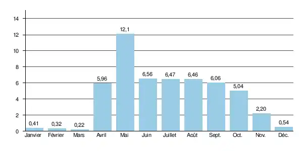 Le débit moyen mensuel observé en mars (minimum d'étiage) est de 0,22 m3/s, alors que le débit moyen du mois de mai se monte à 12,1 m3/s, ce qui signe des variations saisonnières d'amplitude très élevée. Sur la durée d'observation de 26 ans, le débit mensuel minimal a été de 0,010 m3/s (dix litres) en , tandis que le débit mensuel maximal s'élevait à 40,3 m3/s en .