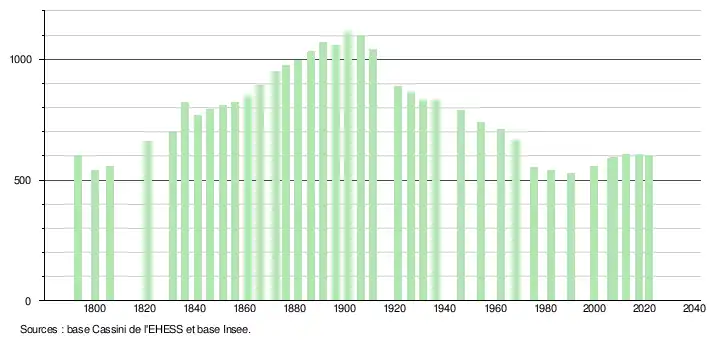 L'évolution du nombre d'habitants est connue à travers les recensements de la population effectués dans la commune depuis 1793. Pour les communes de moins de 10 000 habitants, une enquête de recensement portant sur toute la population est réalisée tous les cinq ans, les populations légales des années intermédiaires étant quant à elles estimées par interpolation ou extrapolation[37]. Pour la commune, le premier recensement exhaustif entrant dans le cadre du nouveau dispositif a été réalisé en 2007[38].