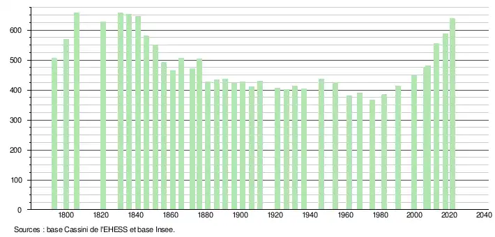 L'évolution du nombre d'habitants est connue à travers les recensements de la population effectués dans la commune depuis 1793. Pour les communes de moins de 10 000 habitants, une enquête de recensement portant sur toute la population est réalisée tous les cinq ans, les populations légales des années intermédiaires étant quant à elles estimées par interpolation ou extrapolation[29]. Pour la commune, le premier recensement exhaustif entrant dans le cadre du nouveau dispositif a été réalisé en 2007[30].