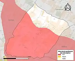 Le retrait-gonflement des sols argileux est susceptible d'engendrer des dommages importants aux bâtiments en cas d’alternance de périodes de sécheresse et de pluie. 69,6 % de la superficie communale est en aléa moyen ou fort (54,2 % au niveau départemental et 48,5 % au niveau national). Sur les 123 bâtiments dénombrés sur la commune en 2019, 107 sont en aléa moyen ou fort, soit 87 %, à comparer aux 57 % au niveau départemental et 54 % au niveau national. Une cartographie de l'exposition du territoire national au retrait gonflement des sols argileux est disponible sur le site du BRGM[11],[Carte 2].