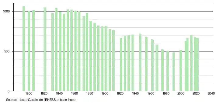 L'évolution du nombre d'habitants est connue à travers les recensements de la population effectués dans la commune depuis 1793. Pour les communes de moins de 10 000 habitants, une enquête de recensement portant sur toute la population est réalisée tous les cinq ans, les populations légales des années intermédiaires étant quant à elles estimées par interpolation ou extrapolation[24]. Pour la commune, le premier recensement exhaustif entrant dans le cadre du nouveau dispositif a été réalisé en 2008[25].