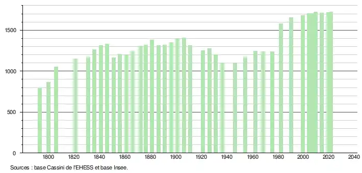 L'évolution du nombre d'habitants est connue à travers les recensements de la population effectués dans la commune depuis 1793. Pour les communes de moins de 10 000 habitants, une enquête de recensement portant sur toute la population est réalisée tous les cinq ans, les populations légales des années intermédiaires étant quant à elles estimées par interpolation ou extrapolation[17]. Pour la commune, le premier recensement exhaustif entrant dans le cadre du nouveau dispositif a été réalisé en 2004[18].