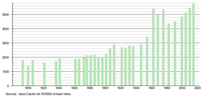 - Par convention dans Wikipédia, le principe a été retenu de n’afficher dans le tableau des recensements et le graphique, pour les populations légales postérieures à 1999, que les populations correspondant à une enquête exhaustive de recensement pour les communes de moins de 10 000 habitants, et que les populations des années 2006, 2011, 2016, etc. pour les communes de plus de 10 000 habitants, ainsi que la dernière population légale publiée par l’Insee pour l'ensemble des communes.