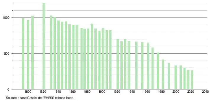 L'évolution du nombre d'habitants est connue à travers les recensements de la population effectués dans la commune depuis 1793. Pour les communes de moins de 10 000 habitants, une enquête de recensement portant sur toute la population est réalisée tous les cinq ans, les populations légales des années intermédiaires étant quant à elles estimées par interpolation ou extrapolation[24]. Pour la commune, le premier recensement exhaustif entrant dans le cadre du nouveau dispositif a été réalisé en 2006[25].