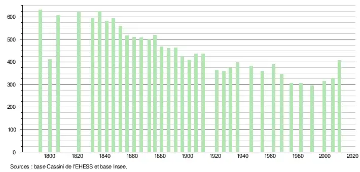 L'évolution du nombre d'habitants est connue à travers les recensements de la population effectués dans la commune depuis 1793. À partir du , les populations légales des communes sont publiées annuellement dans le cadre d'un recensement qui repose désormais sur une collecte d'information annuelle, concernant successivement tous les territoires communaux au cours d'une période de cinq ans. Pour les communes de moins de 10 000 habitants, une enquête de recensement portant sur toute la population est réalisée tous les cinq ans, les populations légales des années intermédiaires étant quant à elles estimées par interpolation ou extrapolation[8]. Pour la commune, le premier recensement exhaustif entrant dans le cadre du nouveau dispositif a été réalisé en 2005[9],[Note 1].