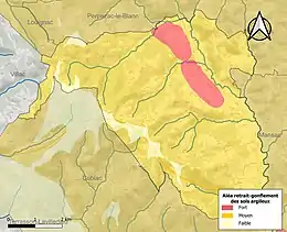 Le retrait-gonflement des sols argileux est susceptible d'engendrer des dommages importants aux bâtiments en cas d’alternance de périodes de sécheresse et de pluie. 95,7 % de la superficie communale est en aléa moyen ou fort (26,8 % au niveau départemental et 48,5 % au niveau national). Sur les 480 bâtiments dénombrés sur la commune en 2019, 462 sont en aléa moyen ou fort, soit 96 %, à comparer aux 36 % au niveau départemental et 54 % au niveau national. Une cartographie de l'exposition du territoire national au retrait gonflement des sols argileux est disponible sur le site du BRGM[16],[Carte 2].