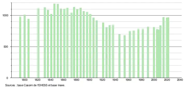 L'évolution du nombre d'habitants est connue à travers les recensements de la population effectués dans la commune depuis 1793. Pour les communes de moins de 10 000 habitants, une enquête de recensement portant sur toute la population est réalisée tous les cinq ans, les populations légales des années intermédiaires étant quant à elles estimées par interpolation ou extrapolation[24]. Pour la commune, le premier recensement exhaustif entrant dans le cadre du nouveau dispositif a été réalisé en 2004[25].